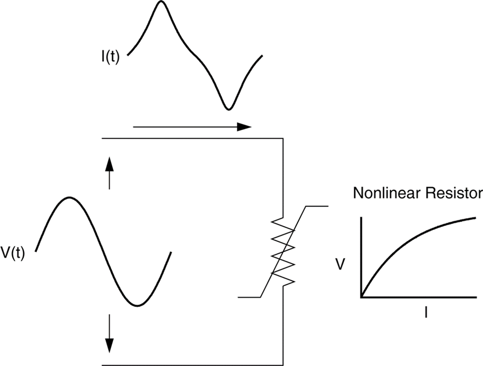 以一個例子來說明這個觀念,一個正弦波電壓加到一個簡單的非線性電阻時,其電壓與電流的變化如曲線所示。雖然所加入的電壓是一個完美的正弦波,但是產生的電流卻是失真的。