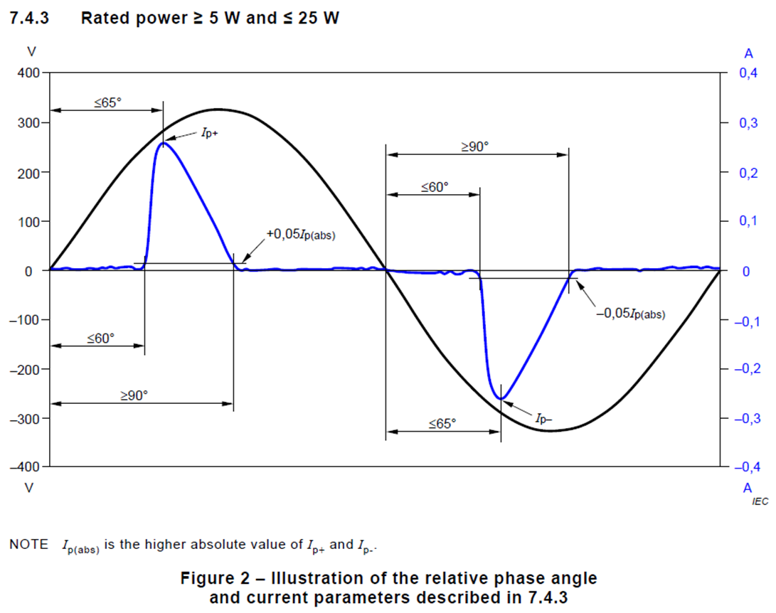 - 第三次諧波電流不得超過主波電流的86%,第五次諧波電流不得超過主波電流的61%,並在60度角達到5%輸入電流波形的峰值電流,最大峰值電流需出現在65度角之前,且在90度角時電流下降不低於峰值的5%。