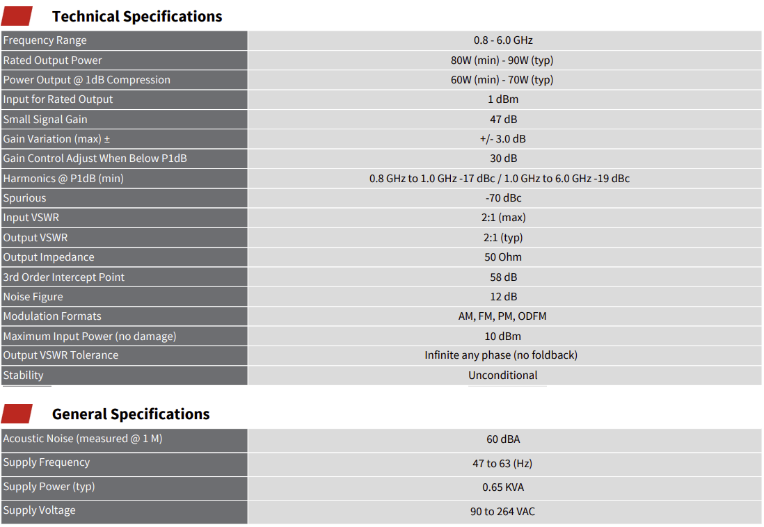 全新A類高功率密度設計使我們能夠在緊湊的4U封裝中生產50瓦、0.8 GHz至6 GHz的放大器。