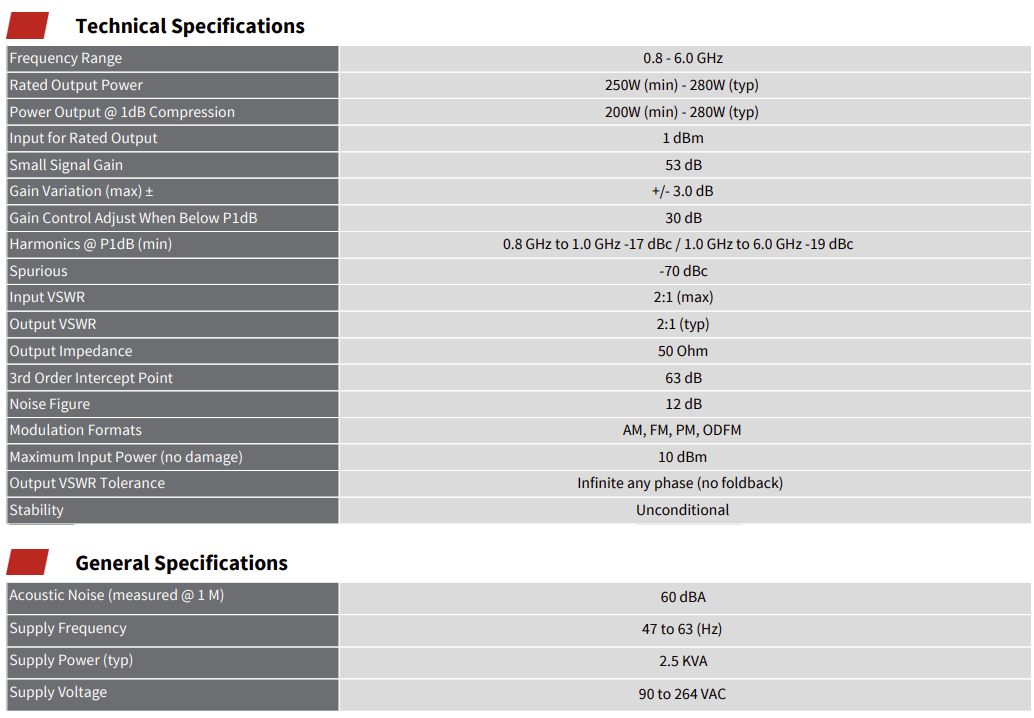 全新A類高功率密度設計使我們能夠在緊湊的7U封裝中生產200瓦、0.8 GHz至6 GHz的放大器。