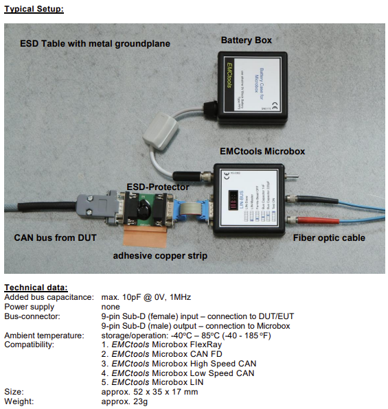 測試實驗室中的靜電放電 (ESD) 測試通常需要使用諸如 FlexRay、CAN(控制器區域網路)和 LIN(本地互連網路)匯流排等電隔離匯流排來控制被測設備。為此,我們提供 EMCtools ESD 保護器和標準光纖匯流排收發器 (Microbox)。它們支援透過光纖電纜進行 CAN/LIN 訊號的雙向資料傳輸,可在 ESD 測試期間用於保護電腦或筆記型電腦免受 ESD 放電的損害。