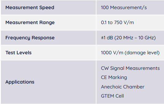此探頭可用於測量 20 MHz 至 10 GHz 寬頻帶內的電場強度。 Raditeq 不斷致力於產品改進,如今終於打造出這款前所未有的精準電場探頭。