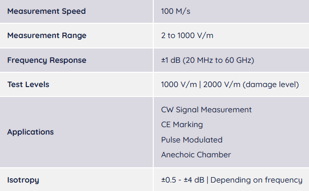 此探頭可用於測量 20 MHz 至 60 GHz 寬頻帶內的電場強度。